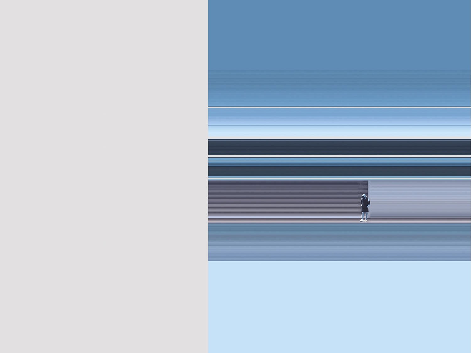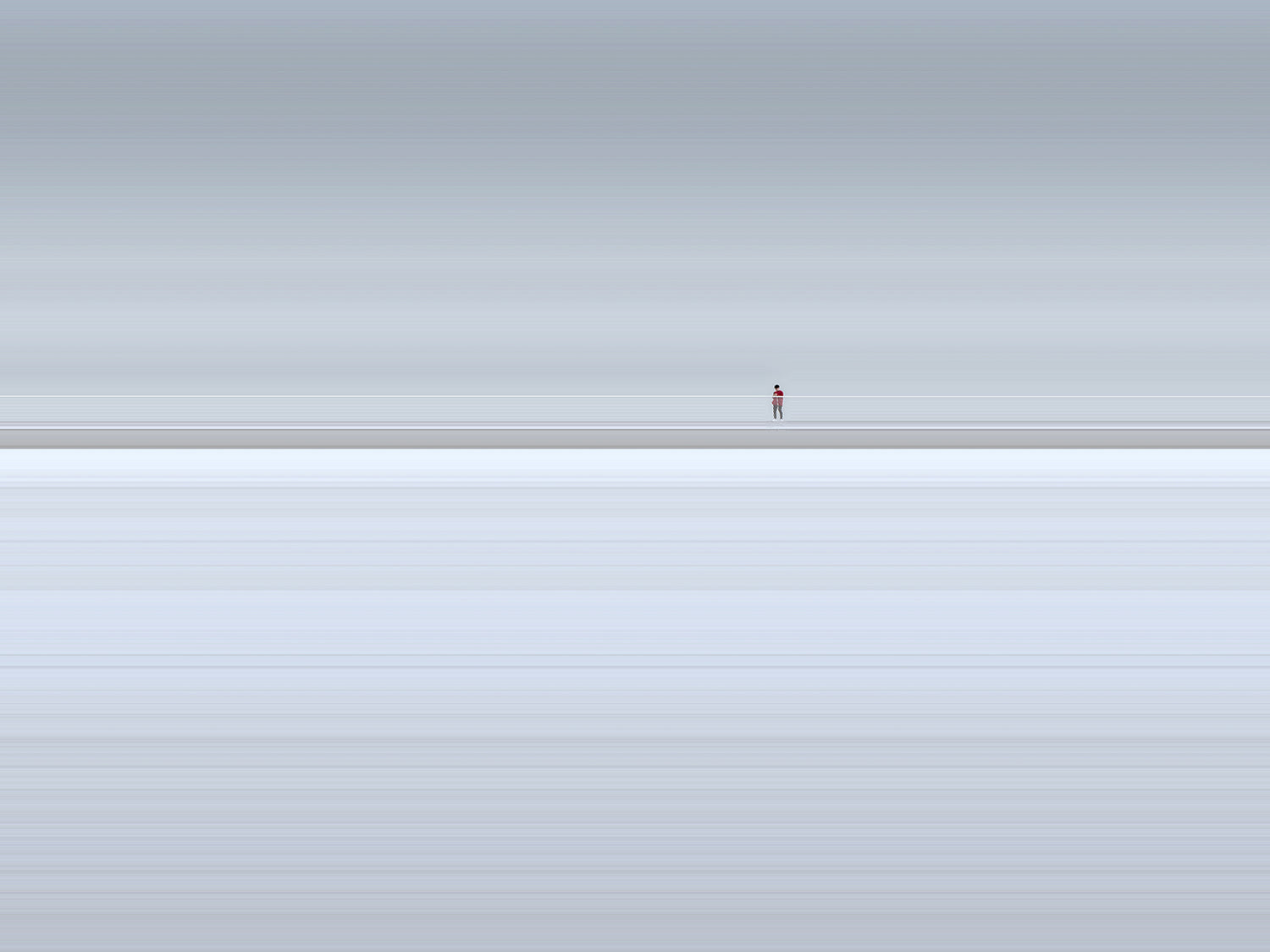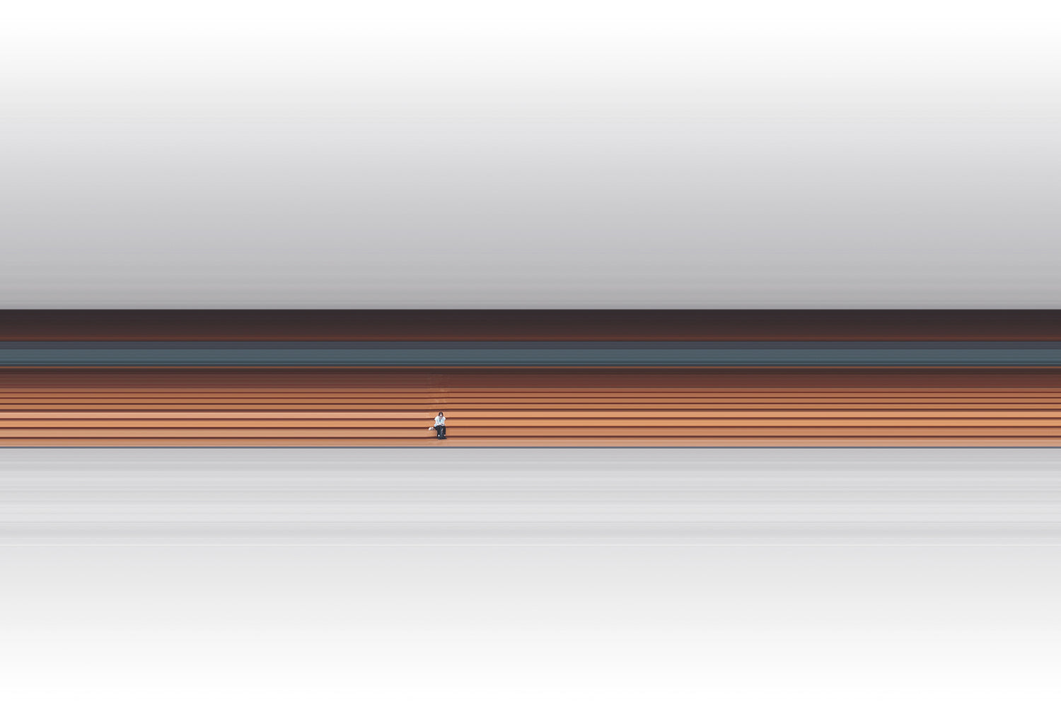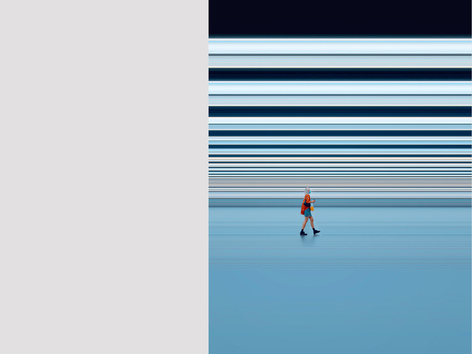 Photographies combinées de manière séquentielle, où chaque image devient une ligne temporelle. Le procédé restructure la prise de vue pour n'en conserver que les lignes graphiques, isolant les personnages et tout ce qui les entoure étirant le temps et l'espace jusqu'à l'infini.