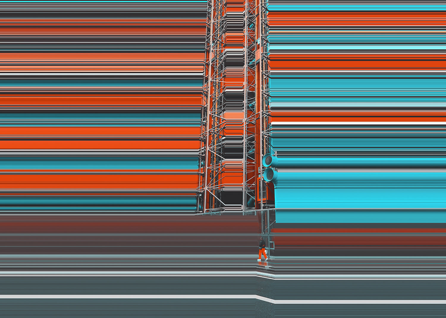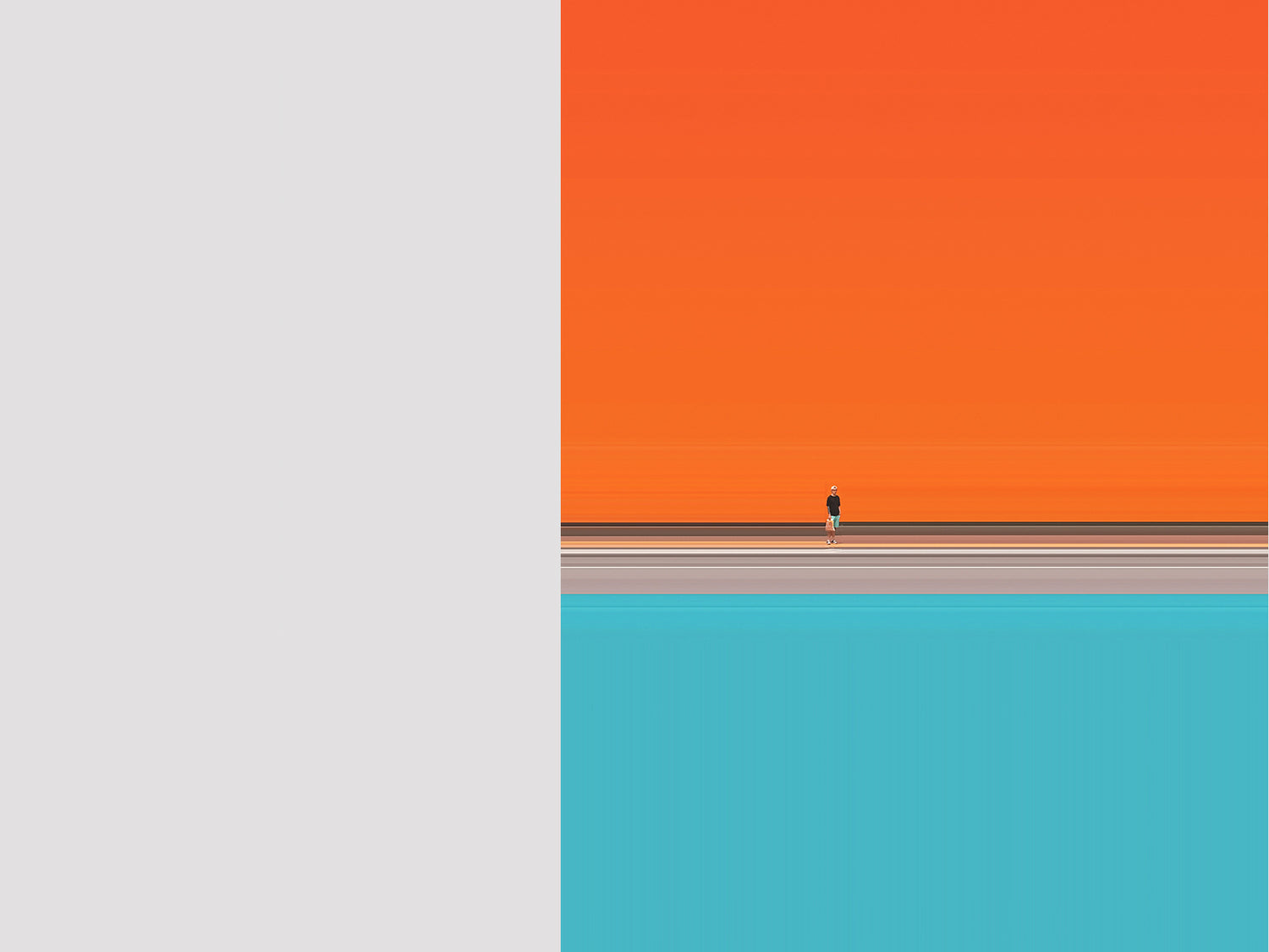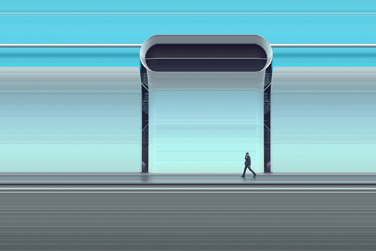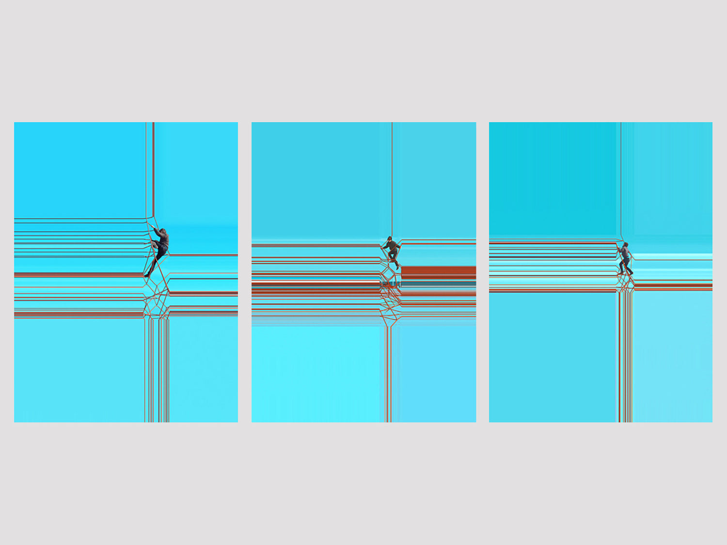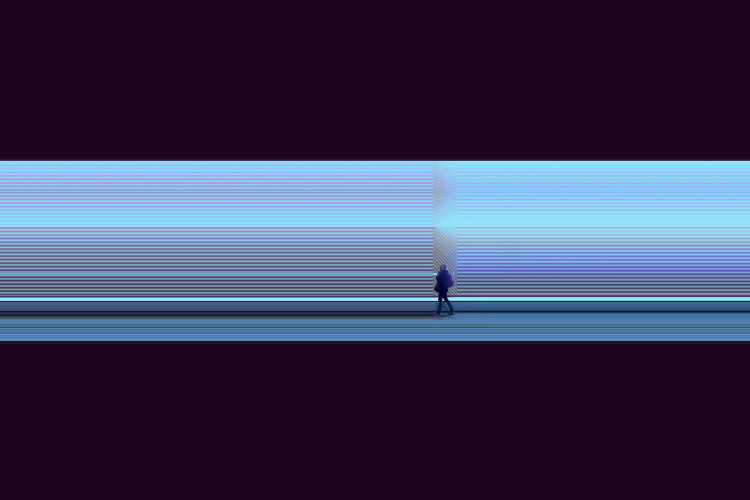 Photographies combinées de manière séquentielle, où chaque image devient une ligne temporelle. Le procédé restructure la prise de vue pour n'en conserver que les lignes graphiques, isolant les personnages et tout ce qui les entoure étirant le temps et l'espace jusqu'à l'infini.